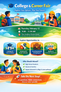 On Thursday, February 12th, we will be hosting our annual College and Career Explorations Fair at Taos Academy. This is an exciting opportunity for our students to meet with representatives from local businesses, colleges, trades, and other career/scholarship support organizations.